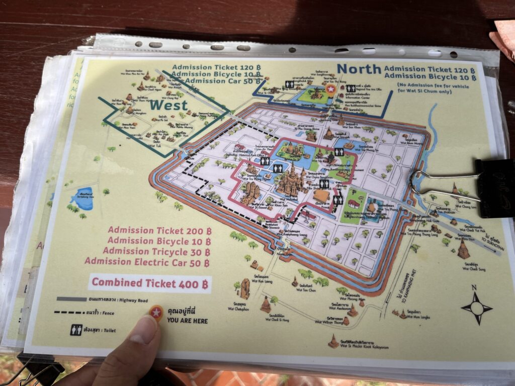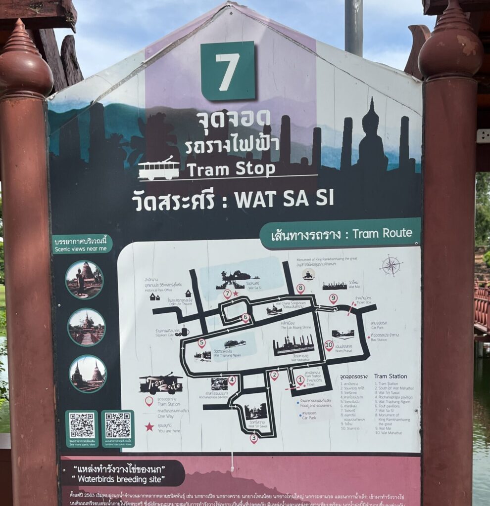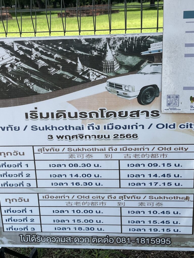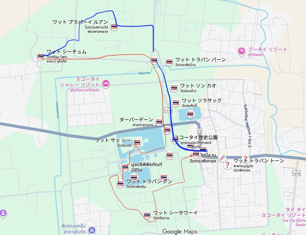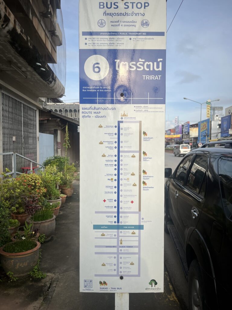 場所は確認しましたが、時刻表と値段がはっきりとはわかりませんでした。一応、僕が宿泊したホテルから一番近いバス停を載せておきます。コスパ的にあまりオススメしません。ルートはスコータイバスターミナルを出発して、新市街、旧市街、バスターミナルに戻るルートです。