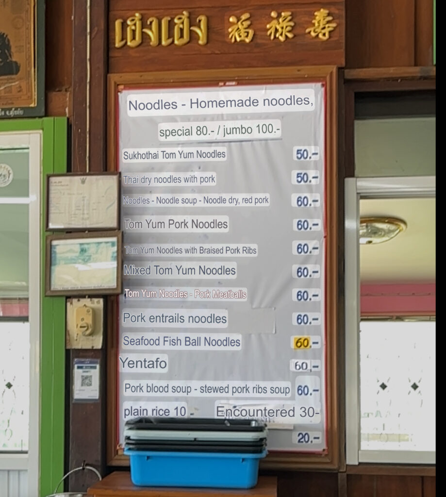 メニューは壁にあり、全てタイ語のためGoogle翻訳での写真を貼っておきます。