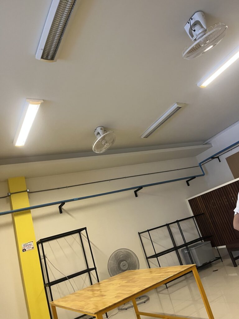 待合室は結構広めで扇風機がたくさんあります。エアコンはないのでちょっと暑いかも。大きめの棚とカゴがあるので終わった洗濯はそこに入れられてました。