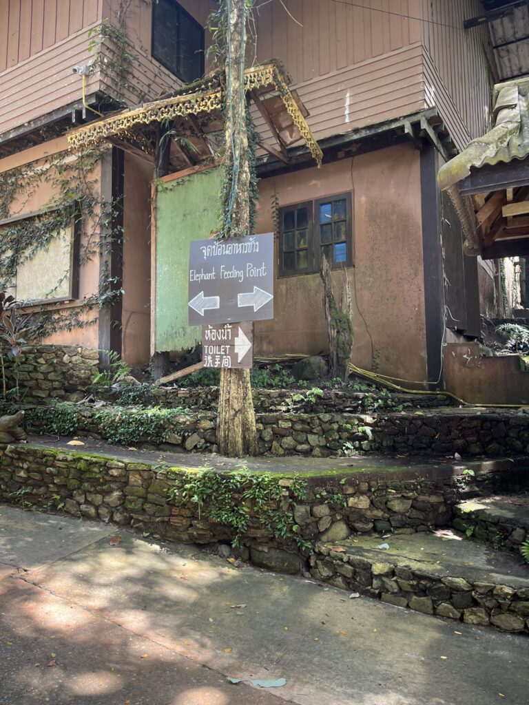 道なりに進むとこの看板が見えると思います。右に曲がると象のエサ引換場所に行けます。