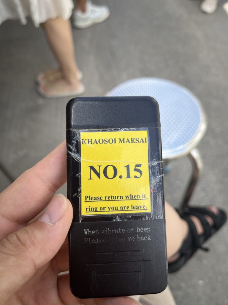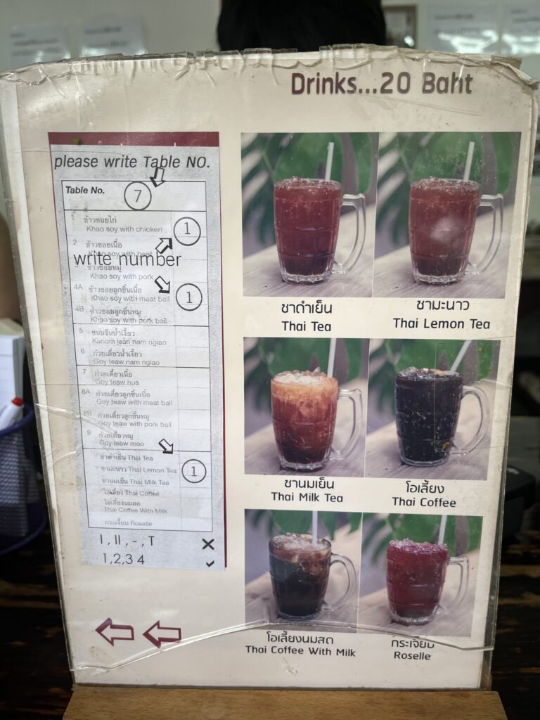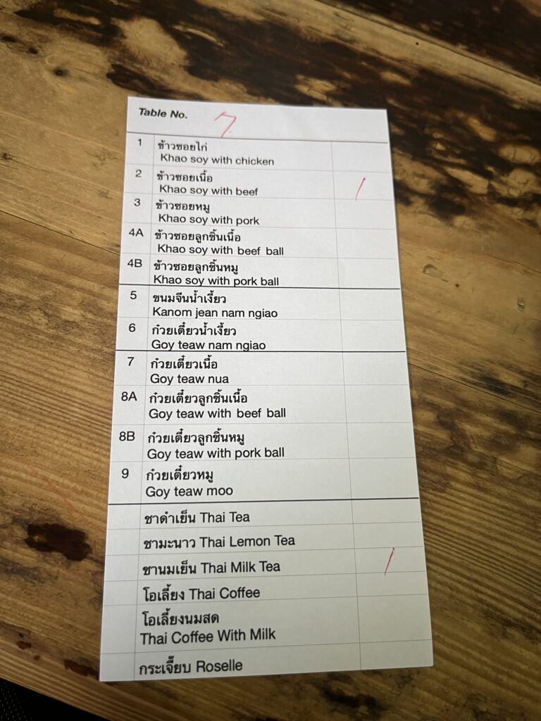 この紙テーブル番号と自分のオーダーを書きます。ここでは牛肉のカオソーイ60バーツ(240円)とタイミルクティー20バーツ(80円)を注文。