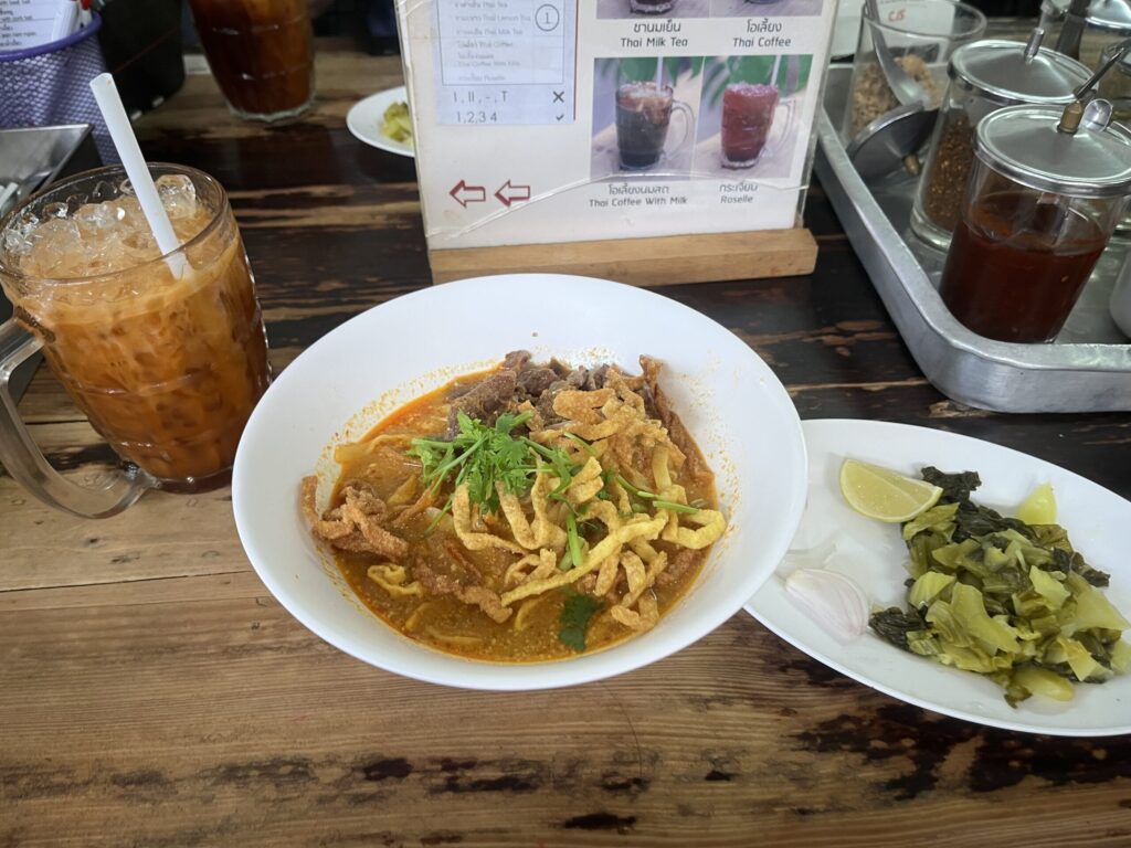 地元の人から観光客まで人気があり、こってりしすぎない濃厚なスープと香り高いカレー風味が特徴。鶏肉や牛肉のカオソーイのほか、サイドメニューに揚げワンタンやサテーなどもあり、気軽に本場の味を楽しめます。