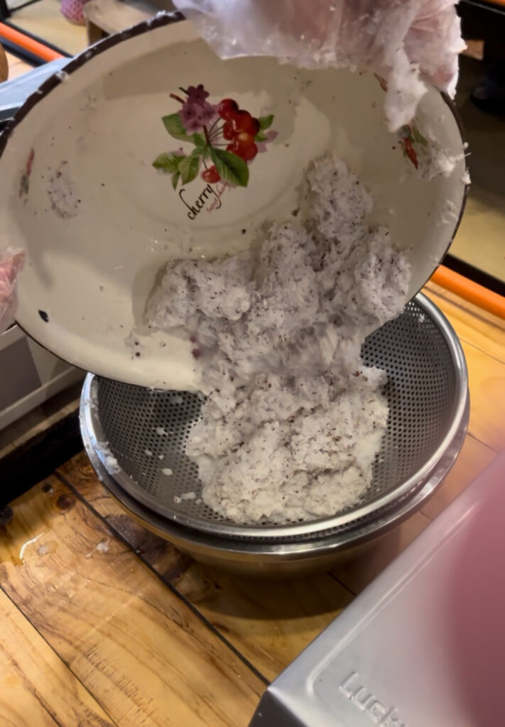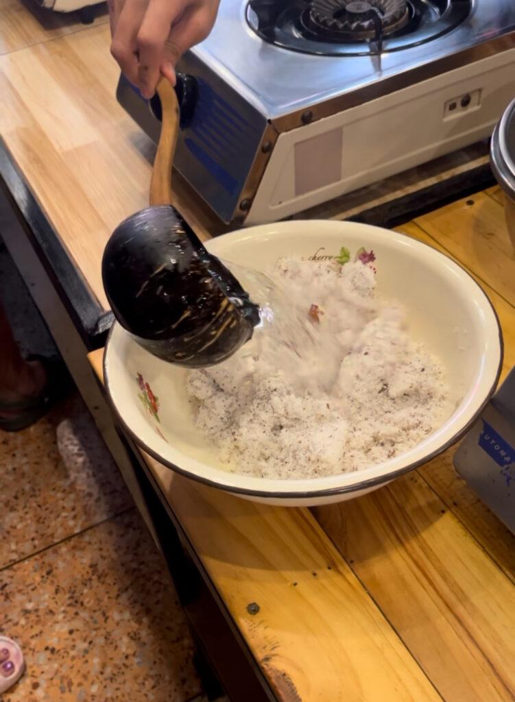 ココナッツを細かくカットしたものに水を加えて揉みながら混ぜていきます。