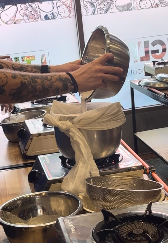全員のココナッツをこしながら1つにまとめて濾していきます。