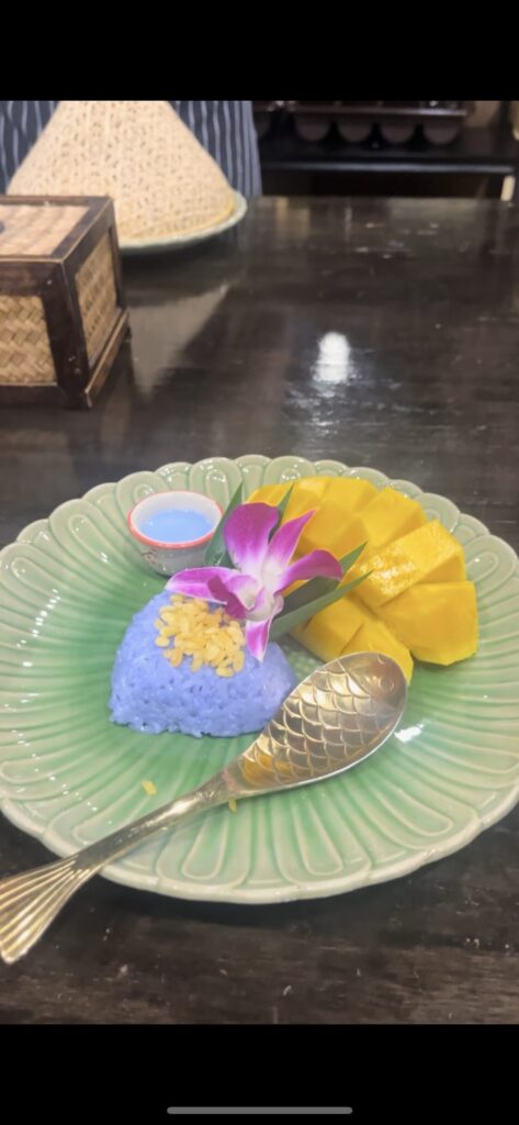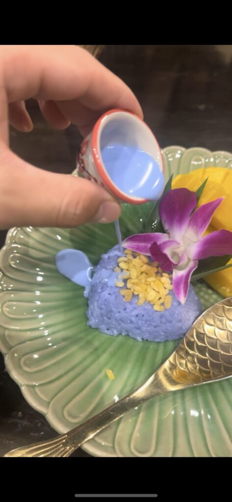 ハッピーソースと呼ばれる青いソース(ココナッツとバタフライピー)をライスにかけて、マンゴーと一緒に食べます。
