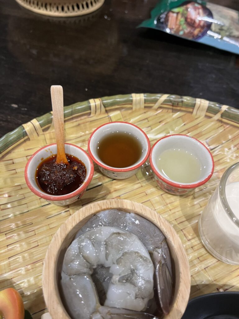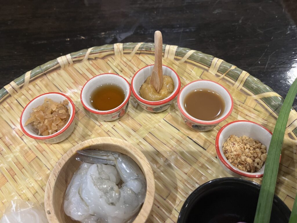 ソースは左から、ニンジンの漬物、フィッシュソース、ココナッツシュガー、タマリンド、ピーナッツです。