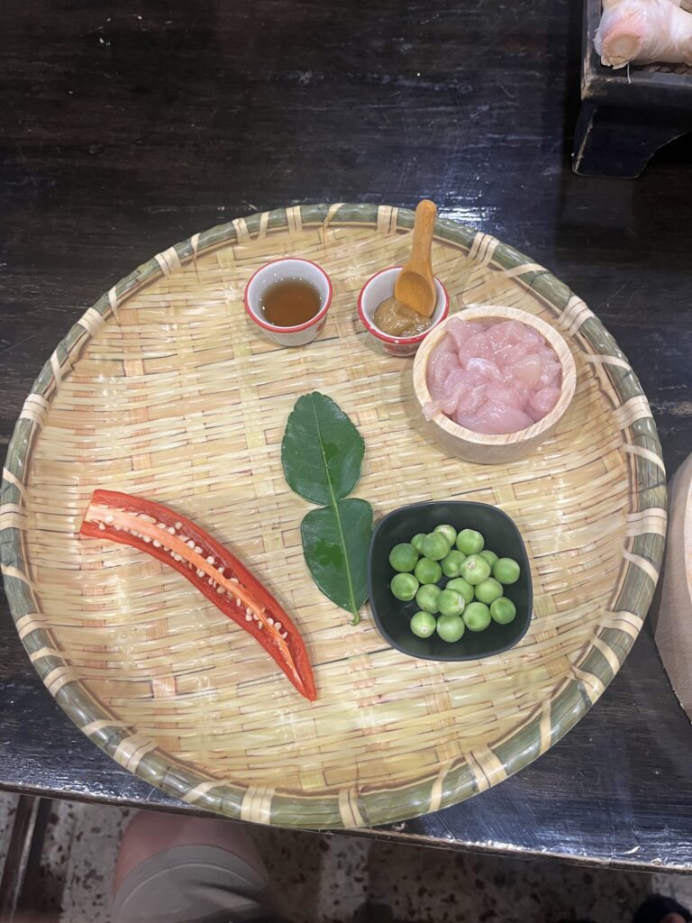 食材は唐辛子、コブミカンの葉、ナス(緑の小さい球体)、チキン、ココナッツシュガー、フィッシュソースです。
