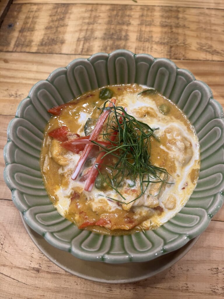 とろみがついたら、お椀に盛り付けます。パプリカと緑(聞くの忘れました)をトッピングして、ココナッツミルクを一周かけて完成です。