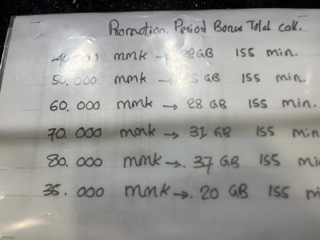 僕は一番下の20GB、155分通話可能で35,000Kyat(約1,300円)。