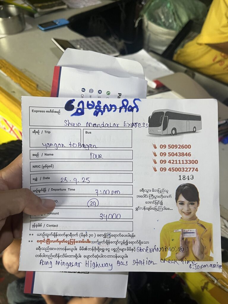 ということでBagan行きの夜行バスを予約してもらいました。写真のような紙をくれます。バス乗り場等も教えてくれました。