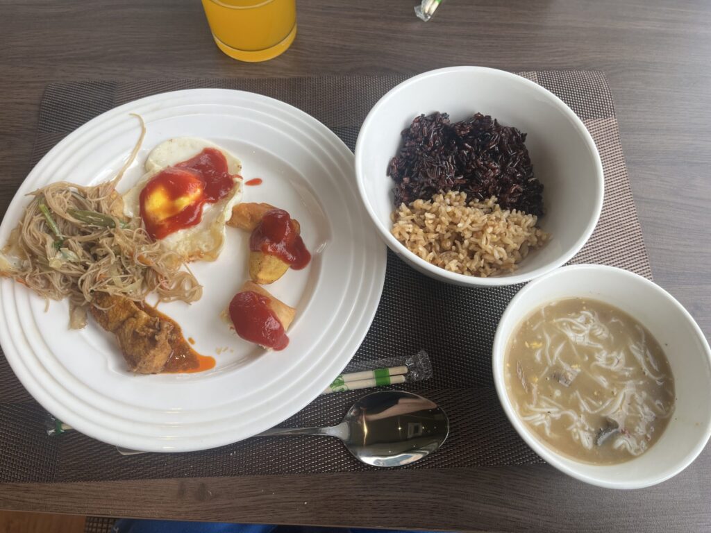 謎のお米(普通に食べれる)、モヒンガー、目玉焼き、ポテト、ビーフンを食べました。
