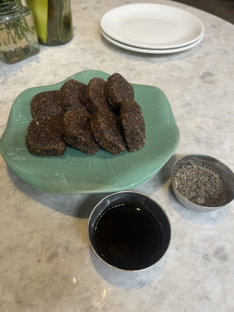 名前は忘れましたが胡麻団子みたいな味でした。右下のすりごまとみたらしをつけて食べます。