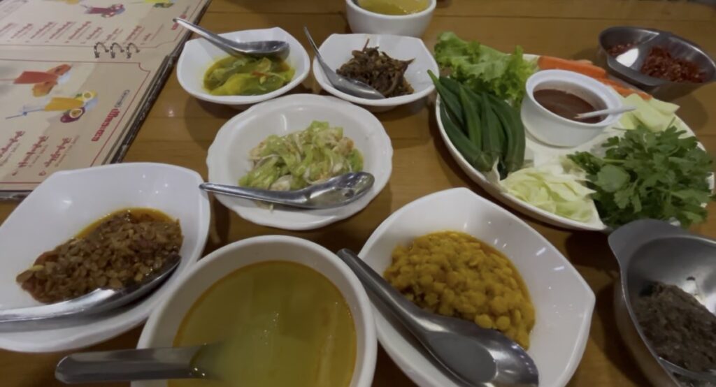 席へ案内されるとミャンマーあるあるの小鉢のおかずがどんどん運ばれてきます。