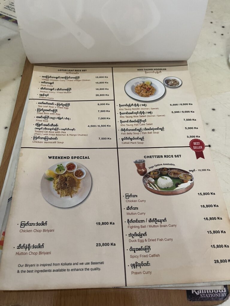 | 食費 | 30,000Kyat | 1,050円 | ミャンマー料理 |