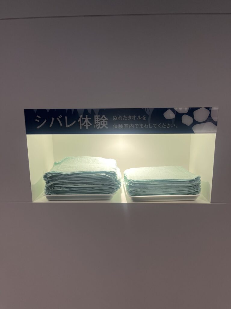 濡れたタオルも準備されており、ぐるぐる回して凍らせる体験ができます。