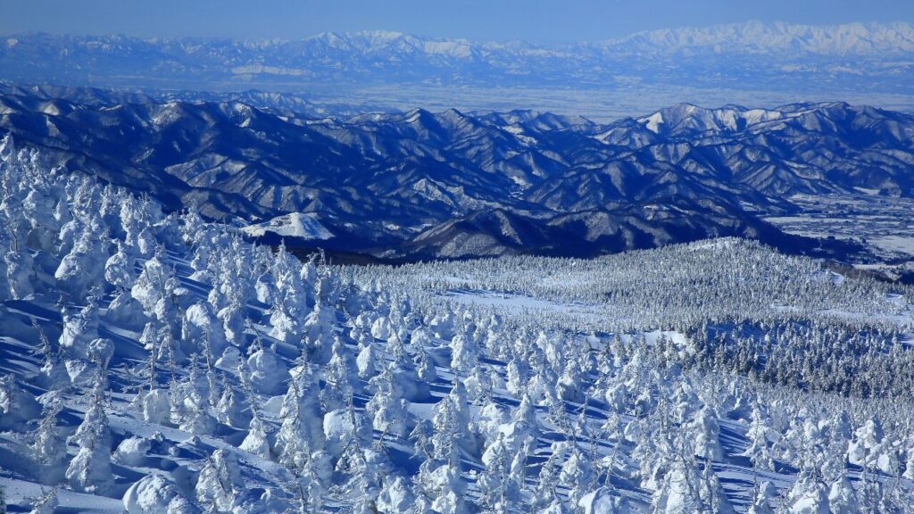 Zao is a mountain resort area located on the border of Yamagata and Miyagi Prefectures. It is one of Japan’s most iconic winter destinations, known for its severe winter climate and dramatic alpine scenery.