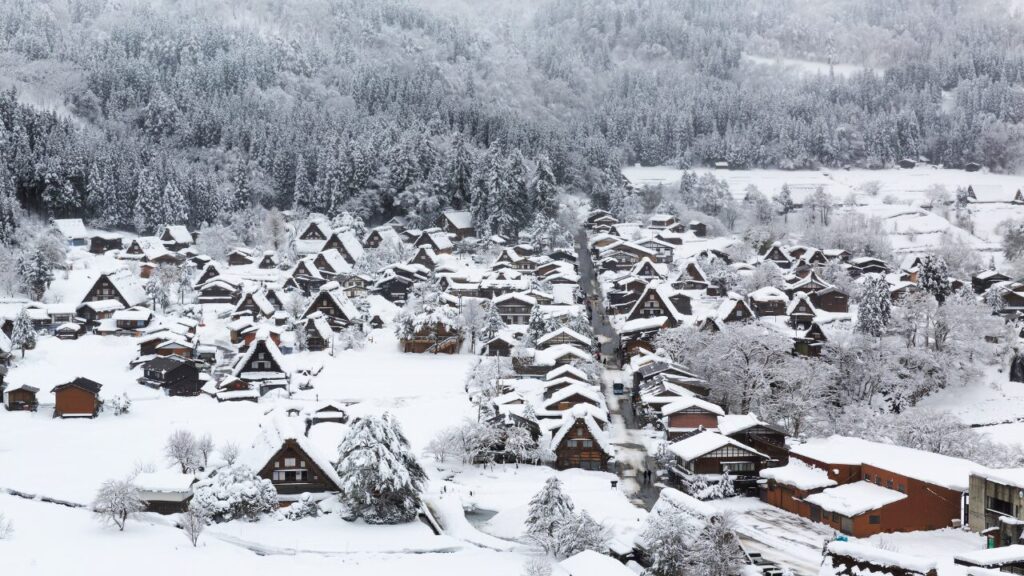 In winter, the village becomes especially magical as deep snow blankets the rooftops, fields, and surrounding mountains, creating a fairytale-like winter landscape unlike anywhere else in Japan.